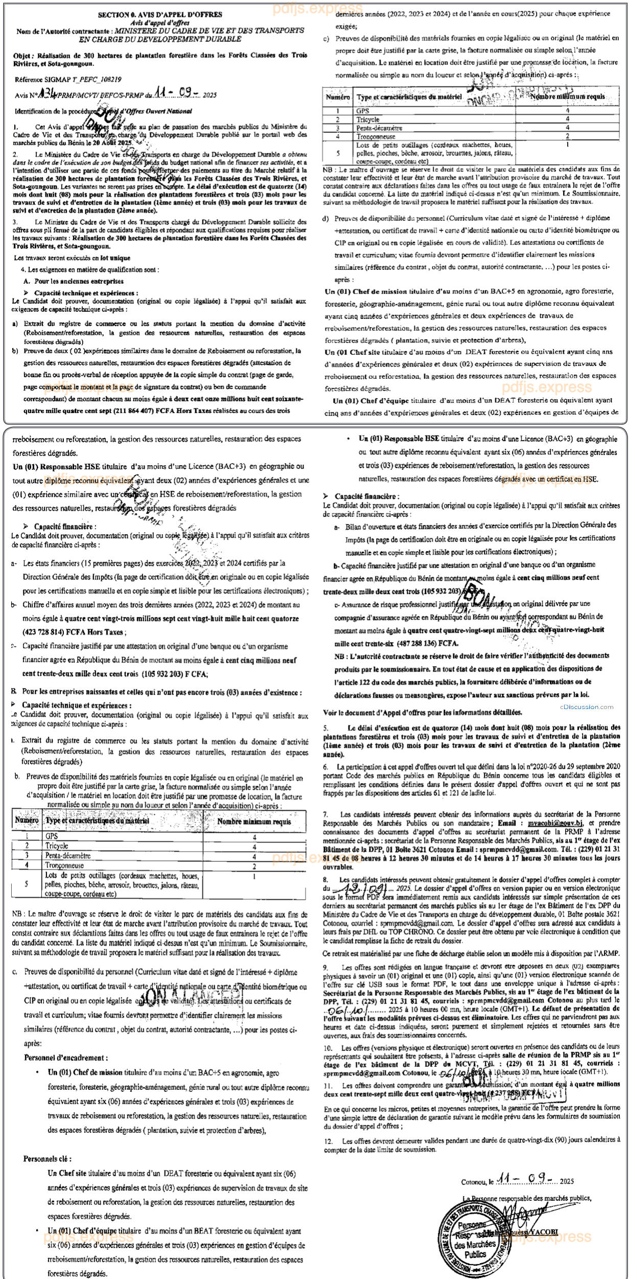 Avis d'appel d'offres relatif à la Réalisation de 300 hectares de plantations forestières dans les Forêts Classées des Trois Rivières, et Sota-Goungoun