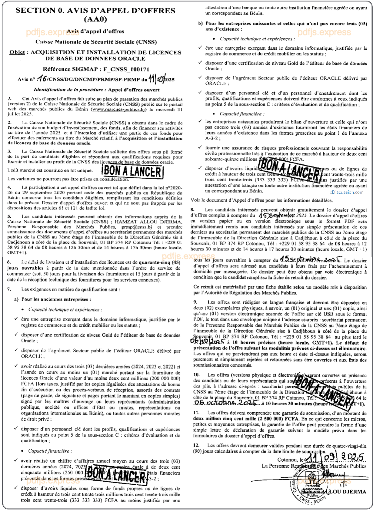 Appel d'offres relatif à l'acquisition et l'installation de licences de base de données oracle