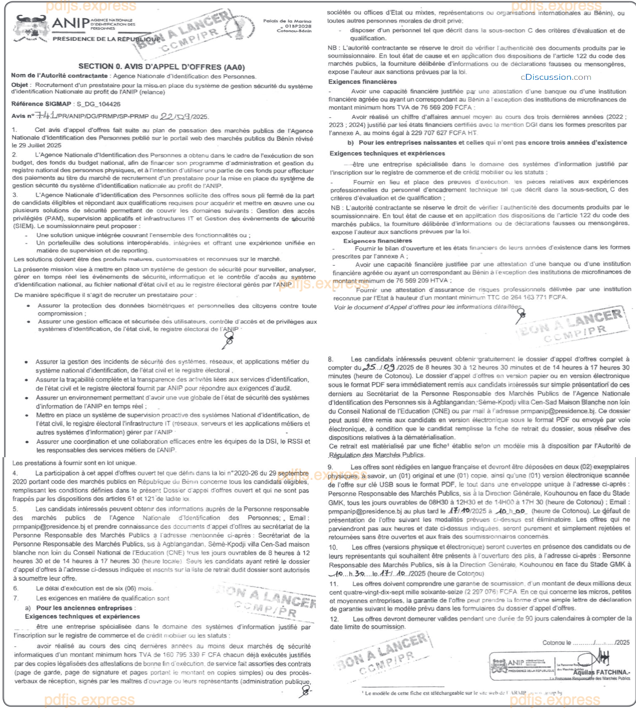 (01) Prestataire pour la mise en place du système de gestion sécurité du système d'Identification Nationale au profit de l'ANIP (Relance)