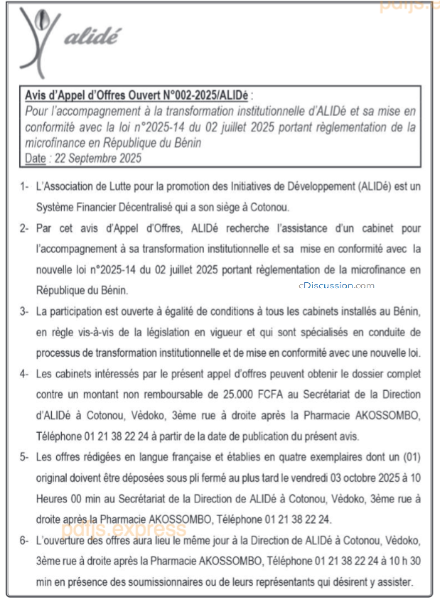 Avis d'appel d'offres ouvert pour l'accompagnement à la transformation institutionnelle d'ALIDé et sa mise en conformité avec la loi n°2025-14 du 02 juillet 2025 portant réglementation de la microfinance en République du Bénin