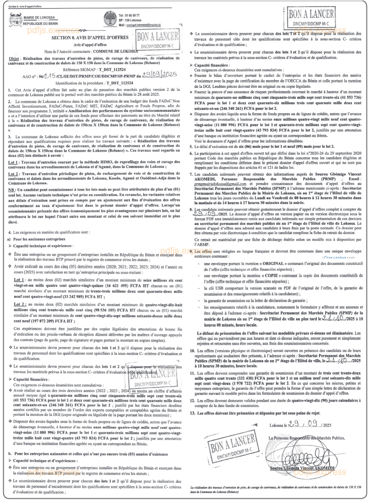 Avis d'appel d'offres relatif à Réalisation des travaux d'entretien de piste, de curage de caniveaux, de réalisation de caniveaux et de construction de dalots de 150 cm X 150 cm dans la Commune de Lokossa