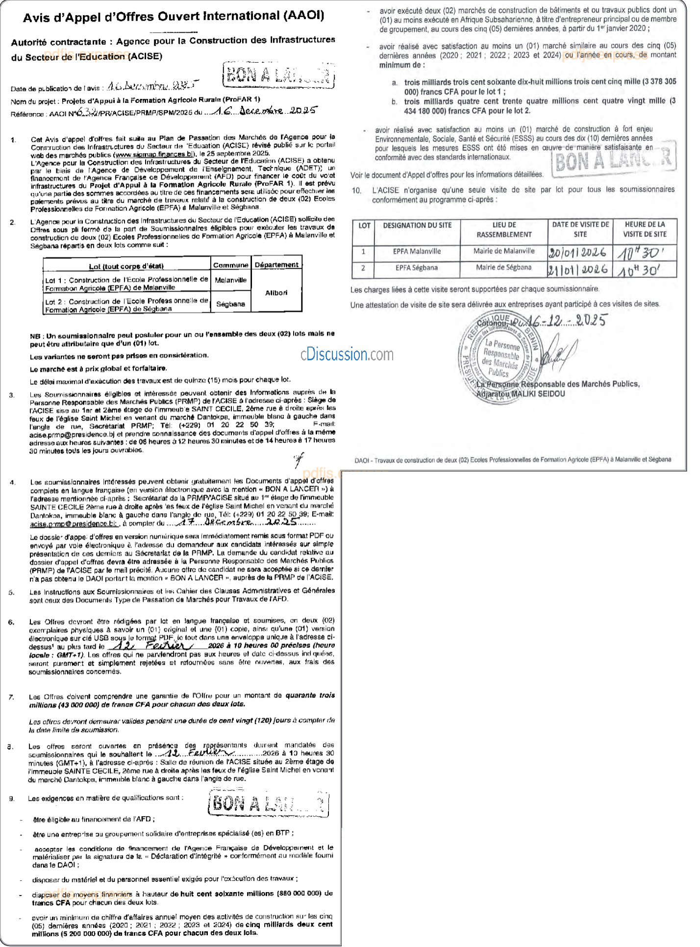Avis d'appel d'offres ouvert international relatif au Projet d'appui à la Formation Agricole Rurale ( ProFAR)