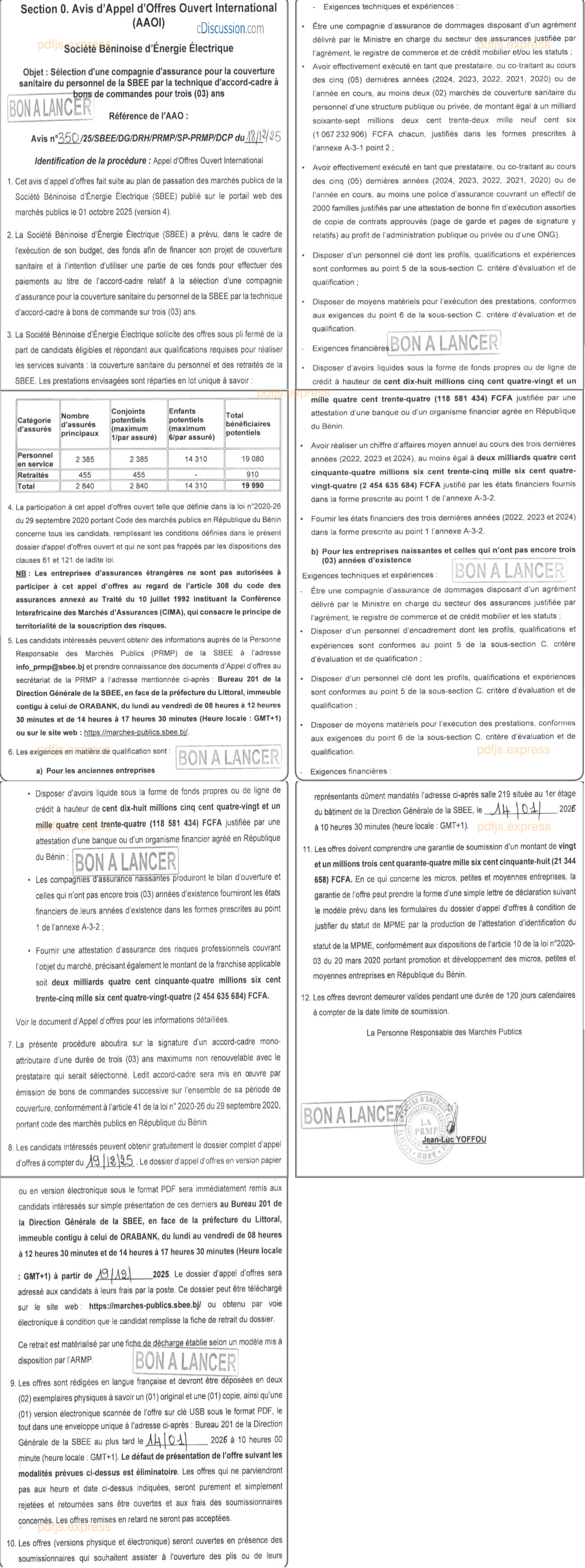 Avis d'Appel d'Offres Ouvert International pour la sélection d'une compagnie d'assurance pour la couverture sanitaire du personnel de la SBEE par la technique d'accord-cadre à bons de commandes pour trois(03) ans