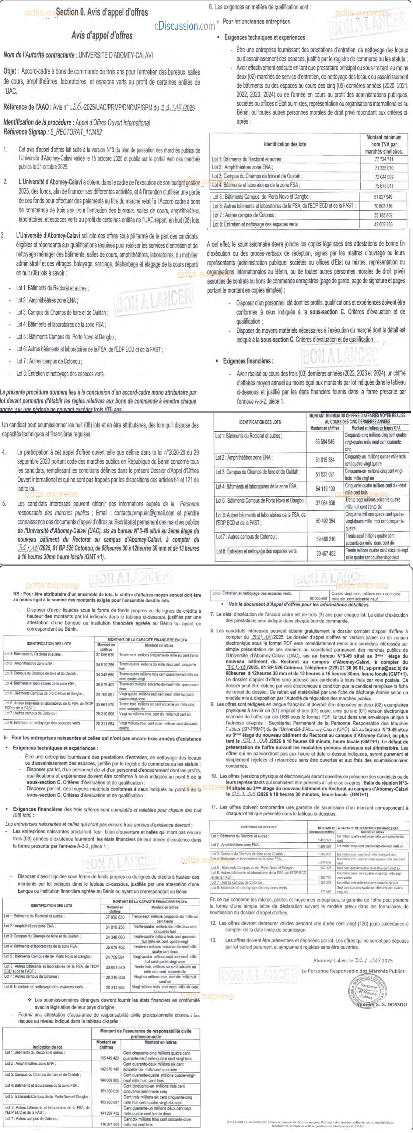 Avis d'appel d'offres relatif à l'accord-cadre à bons de commande de trois ans pour l'entretien des bureaux, salles de cours, amphithéâtres, laboratoires, et espaces verts au profit de certaines entités de l'UAC
