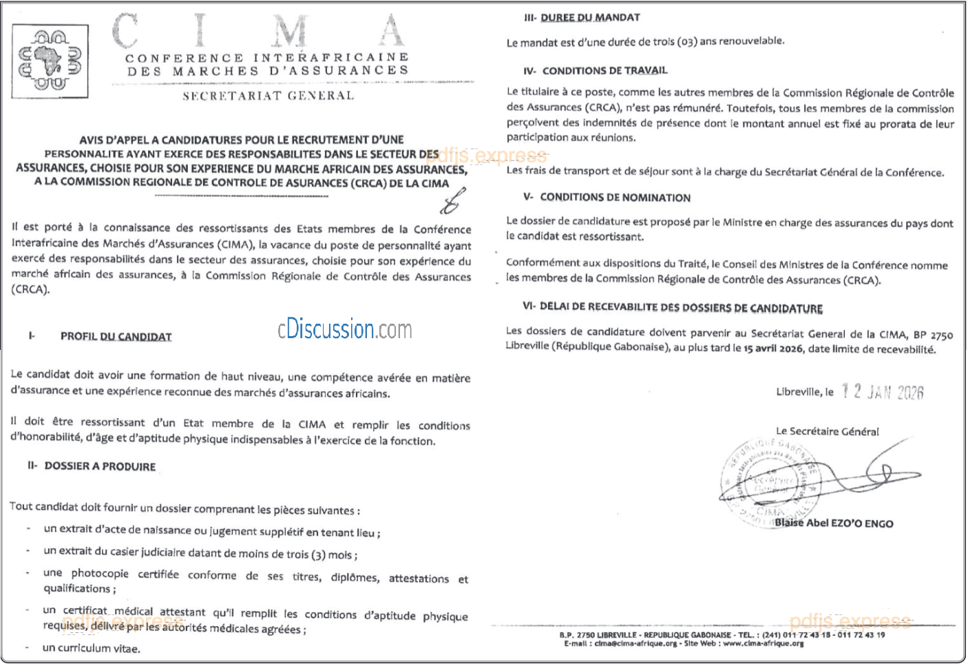 AVIS A CANDIDATURES POUR LE RECRUTEMENT D'UNE PERSONNALITE AYANT EXERCE DES RESPONSABILITES DANSLE SECTEUR DES ASSURANCES, CHOISIE POUR SON EXPERIENCE DU MARCHE AFRICAIN DES ASSURANCES, A LA COMMISSION REGIONALE DE CONTRÔLE DES ASSURANCES(CRCA) DE LA CIMA