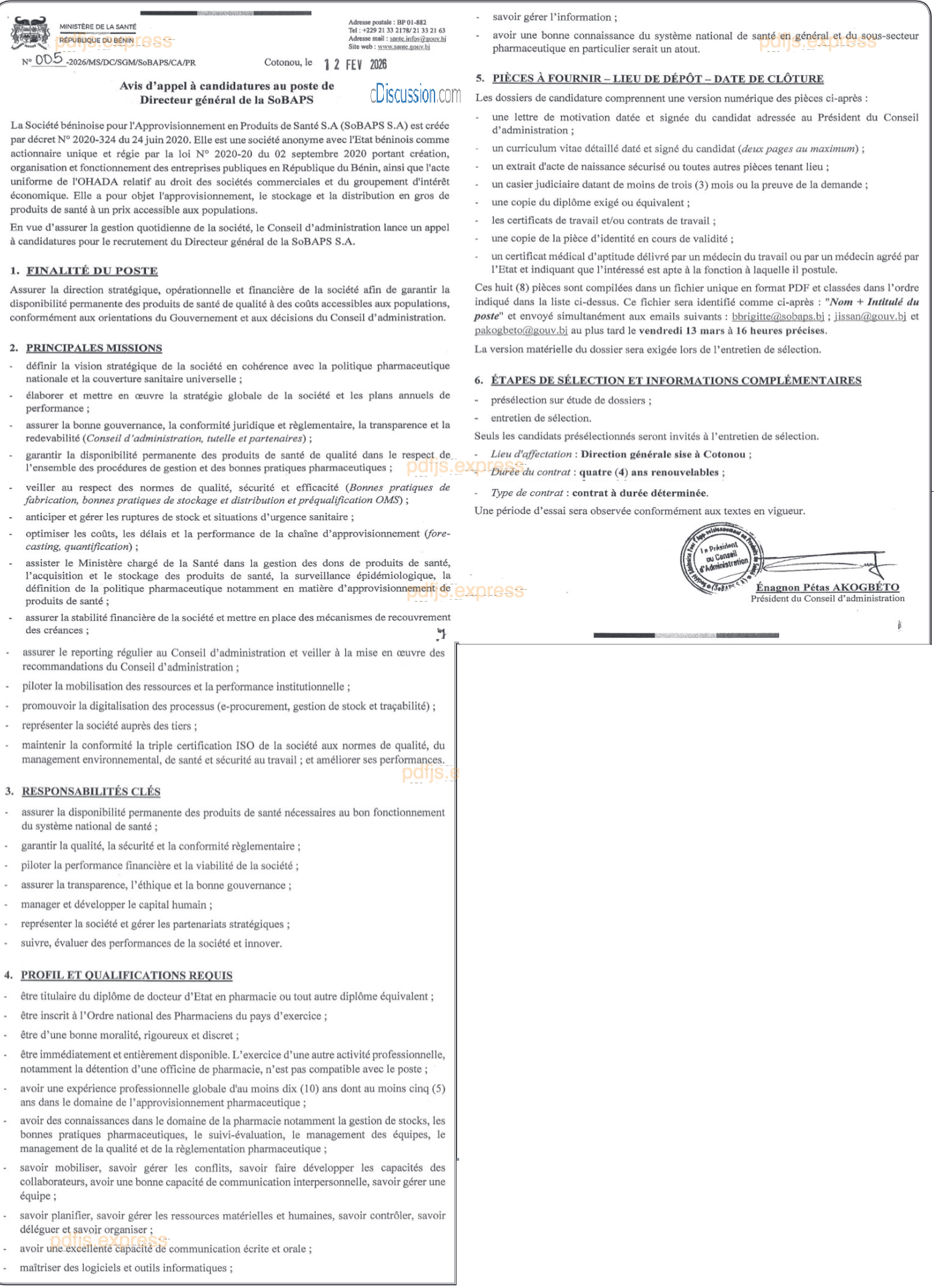 AVIS D'APPPEL A CANDIDATURE AU POSTE DE DIRECTEUR GENERAL DE LA SoBAPS