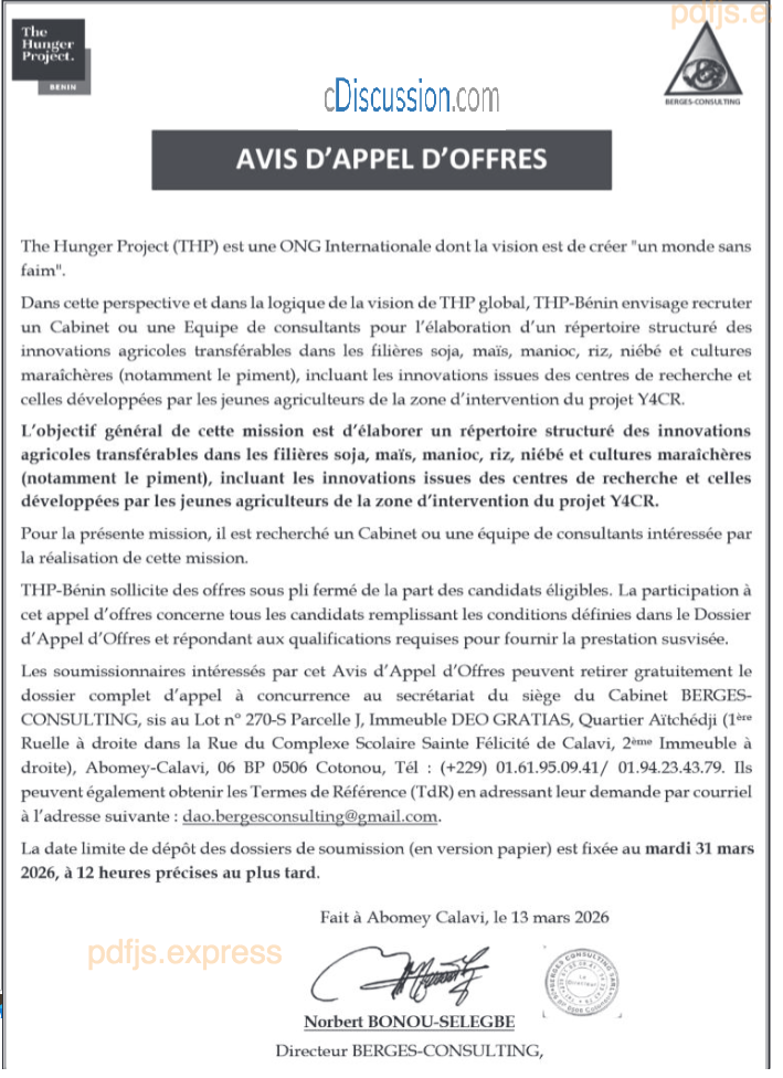 AVIS D'APPEL D'OFFRES PORTANT SUR L'ELABORATION D'UN REPERTOIRE STRUCTURE DES INNOVATIONS AGRICOLES TRANSFERABLES DANS LES FILIERES SOJA, MAÏS, MANIOC, RIZ, NIEBE ET CULTURES MARAÎCHERES(NOTAMMENT LE PIMENT), INCLUANT LES INNOVATIONS ISSUES DES CENTRES DE RECHERCHE ET CELLES DEVELOPPEES PAR LES JEUNES AGRICULTEURS DE LA ZONE D'INTERVENTION DU PROJET Y4CR
