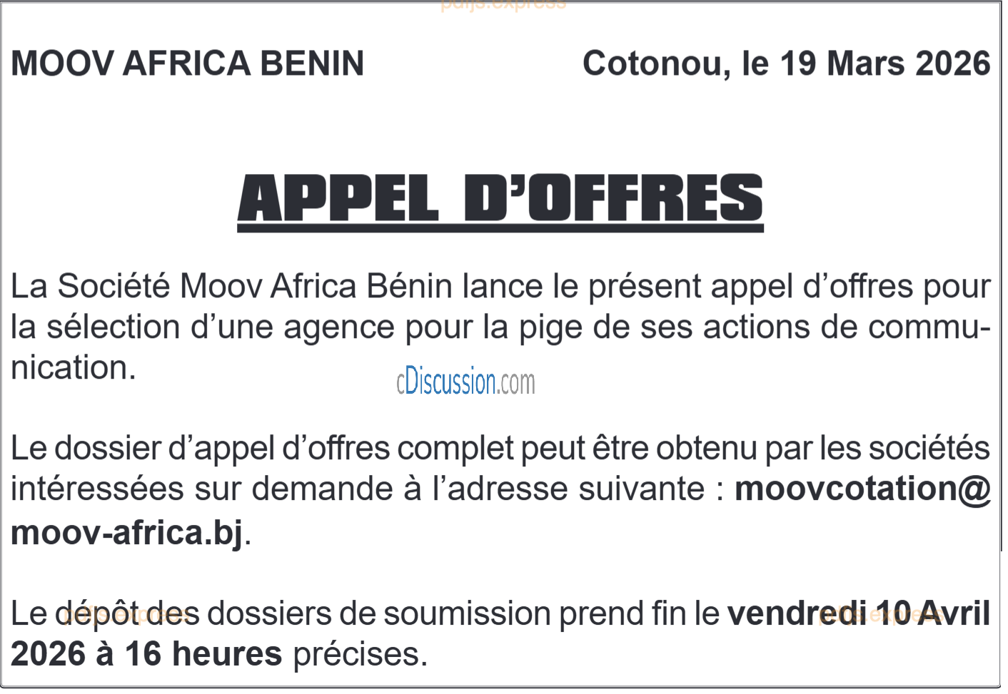 APPEL D'OFFRES POUR LA SELECTION D'UNE AGENCE POUR LA PIGE DE SES ACTIONS DE COMMUNICATION