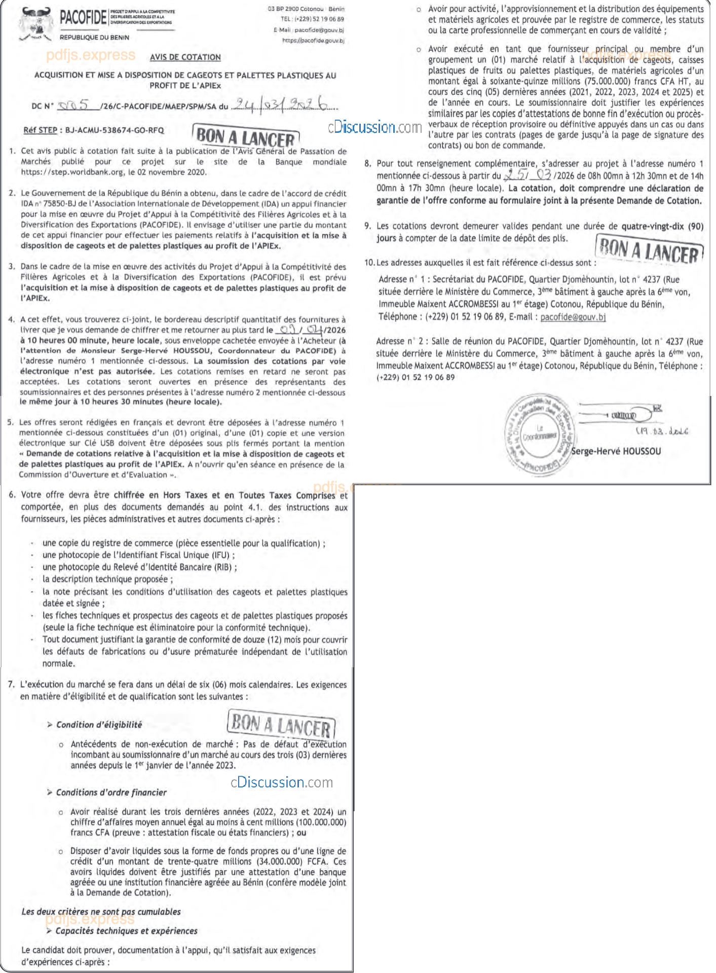 AVIS DE COTATION: ACQUISITION ET MISE A DISPOSITION DE CAGEOTS ET PALETTES PLASTIQUES AU PROFIT DE L'APIEX