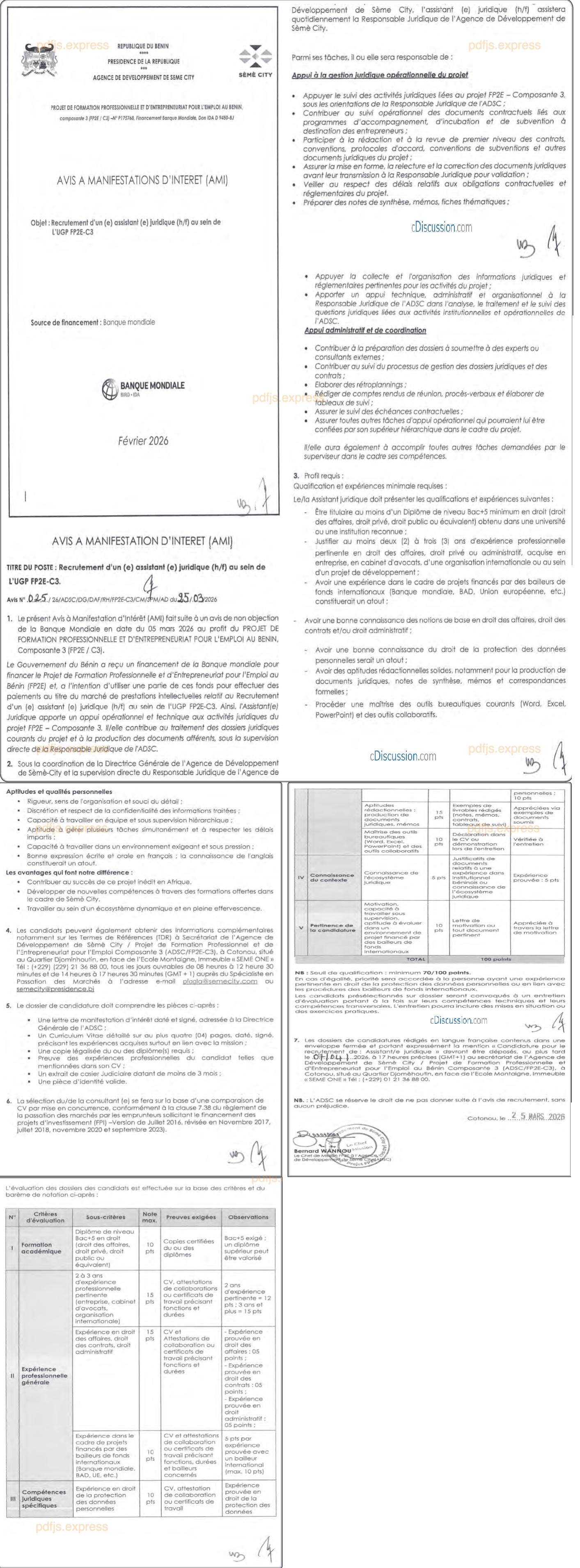 AVIS A MANIFESTATION(AMI): RECRUTEMENT D'UN(E) ASSISTANT(E) JURIDIQUE AU SEIN DE L'UGP FP2E-C3