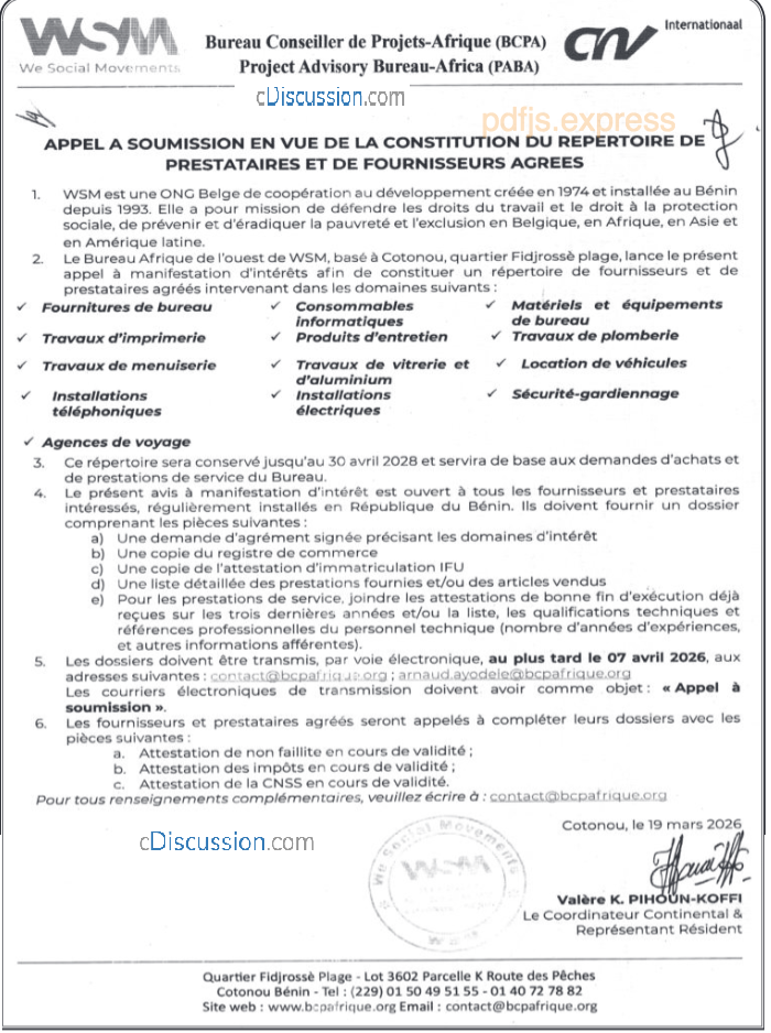 APPEL A SOUMISSION EN VUE DE LA CONSTITUTION DU REPERTOIRE DE PRESTATAIRES ET DE FOURNISSEURS AGREES