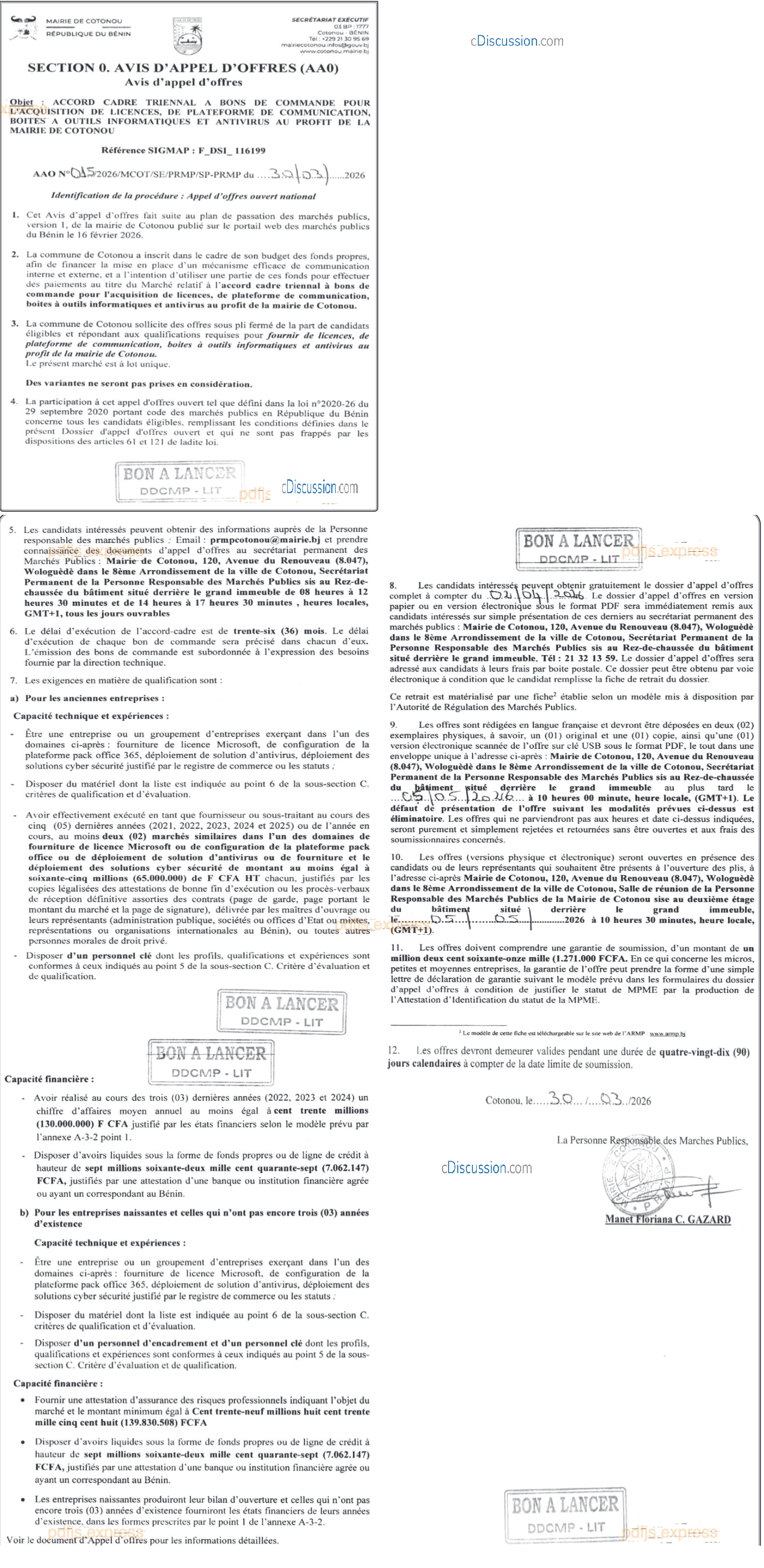 AVIS D'APPEL D'OFFRES(AAO): ACCORD CADRE TRIENNAL A BONS DE COMMANDE POUR L'ACQUISITION DE LICENCES, DE PLATEFORME DE COMMUNICATION, BOITES A OUTILS INFORMATIQUES ET ANTIVIRUS AU PROFIT DE LA MAIRIE DE COTONOU